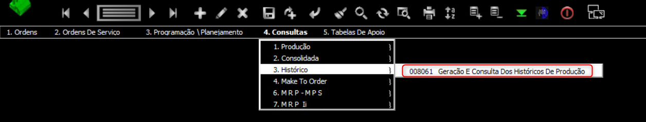3. Selecione Consultas > Histórico > 008061 Geração E Consulta Dos Históricos De Produção para abrir a tela.
