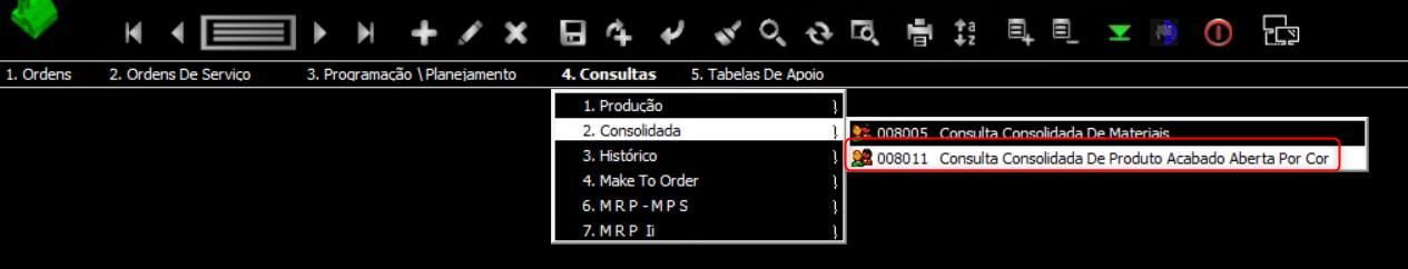 3. Selecione Consultas > Consolidada > 008011 Consulta Consolidada De Produto Acabado Aberta Por Cor para abrir a tela.