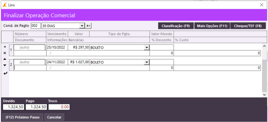 Em Vendas\Movimentações, selecione o evento configurado para executar a operação de venda com bonificação e preencha os dados da venda.