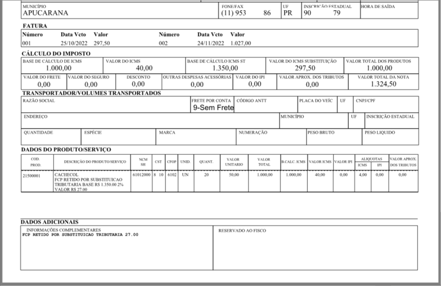 - O segundo referente ao produto vendido + o FCP