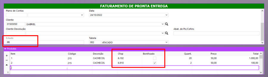 No exemplo da movimentação abaixo, temos um exemplo onde o mesmo produto está sendo vendido com substituição tributária (6.102) e sendo enviado como bonificação (6.910).