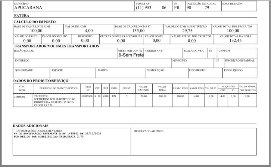 NFe 1445902 – Produto bonificado e com substituição tributária