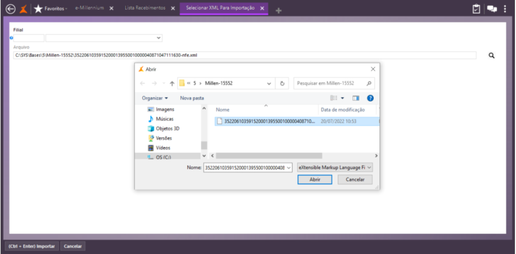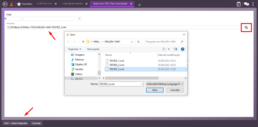 Para selecionar o arquivo a ser importado para o e-Millennium, clique na lupa, na janela selecione o arquivo e mande abrir. O campo Arquivo será carregado com o item selecionado, clique em Importar e aguarde a mensagem de comando executado com sucesso.