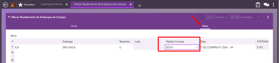 Acesse a guia Itens e preencha a coluna Pedido Compra selecionando o pedido recebido no XML que será auditado e clique em Salvar.
