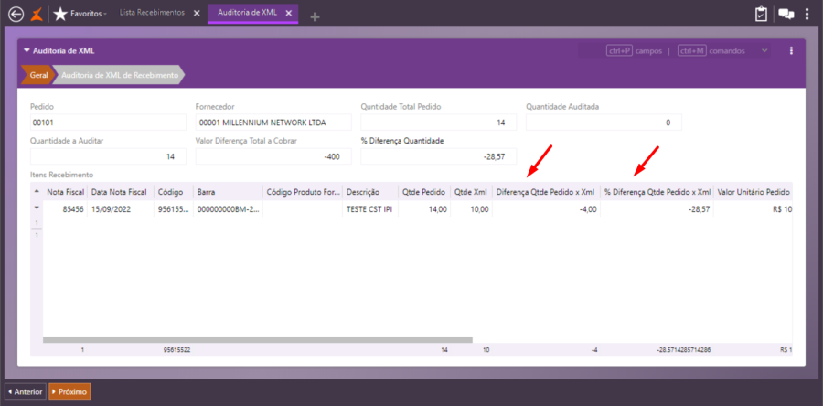Na primeira tela exibida, o operador poderá conferir os dados do pedido de compra e comparar com os dados do XML recebido. Perceba que o sistema mostra as divergências encontradas comparando as informações das duas origens de dados.
