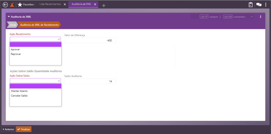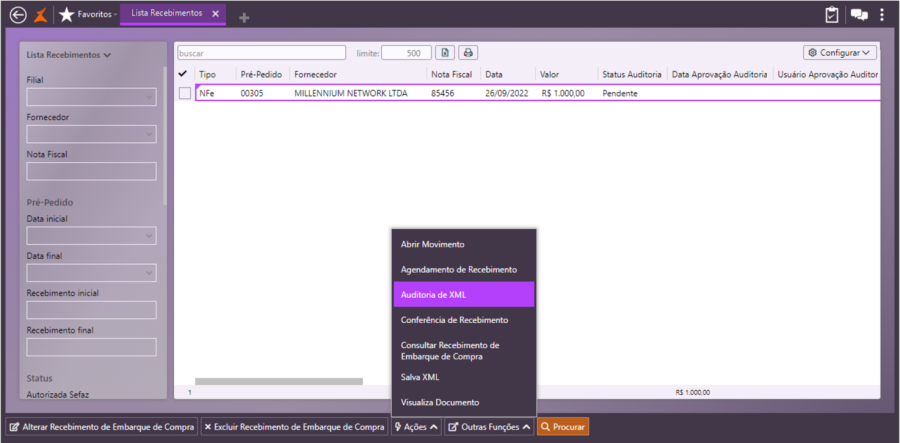 Novamente na tela de recebimento, selecione o arquivo importado e, na guia Ações, selecione a opção Auditoria de XML. Observe que o status de auditoria consta como pendente.