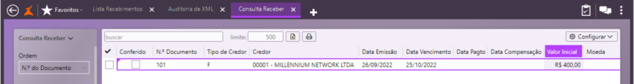 Em Financeiro\A Receber, faça uma consulta preenchendo o campo de filtro Tipo Devedor com a opção Fornecedor e veja o título que foi gerado com o valor da diferença encontrada na auditoria.