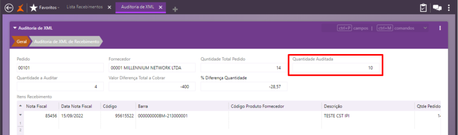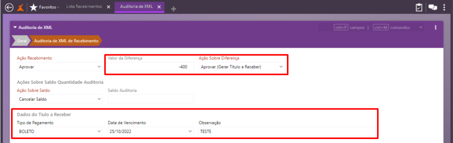 Nesse caso, a empresa aprova o recebimento do arquivo XML e não abona o valor da divergência encontrada na auditoria e gerando um título a receber do fornecedor.