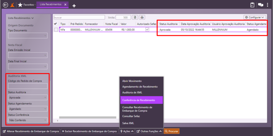 A etapa final do processo de auditoria é o recebimento do embarque de compra, uma vez que ele foi devidamente auditado e as informações do arquivo XML estão aprovadas.