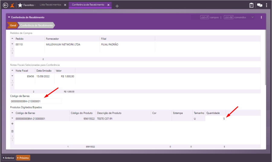 As informações do pedido serão carregadas na tela, para que o operador inicie a leitura dos códigos de barras. Neste exemplo, lançaremos a quantidade 5 para mostrar como o sistema se comporta no caso de divergência a menos.