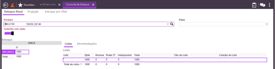 Antes de fazer o faturamento do embarque, vamos verificar a quantidade em estoque para o produto, dessa forma poderemos analisar com maior clareza o reflexo final do processo de auditoria. Perceba que existem 1.000 unidades em estoque para o produto a ser recebido.
