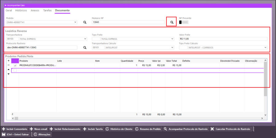 - Acione o ícone da lupa no campo para carregar as informações da transportadora que irá realizar o transporte da devolução do produto.