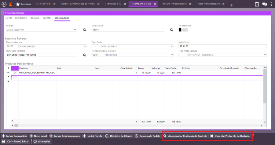 Para acompanhar o andamento do chamado, na tela de consulta, selecione o chamado do cliente e acesse Acompanhar Protocolo de Rastreio.