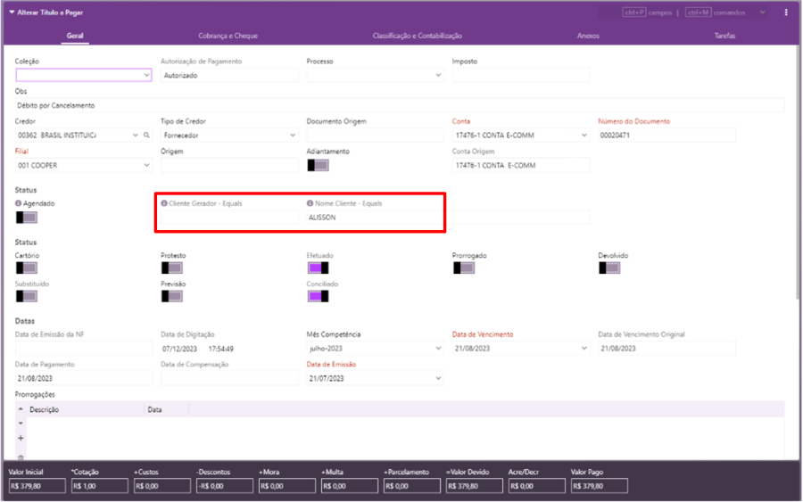 Foi inserido um campo para exibição do nome do cliente gerador na tela de alteração do título a pagar, gerado na conciliação.