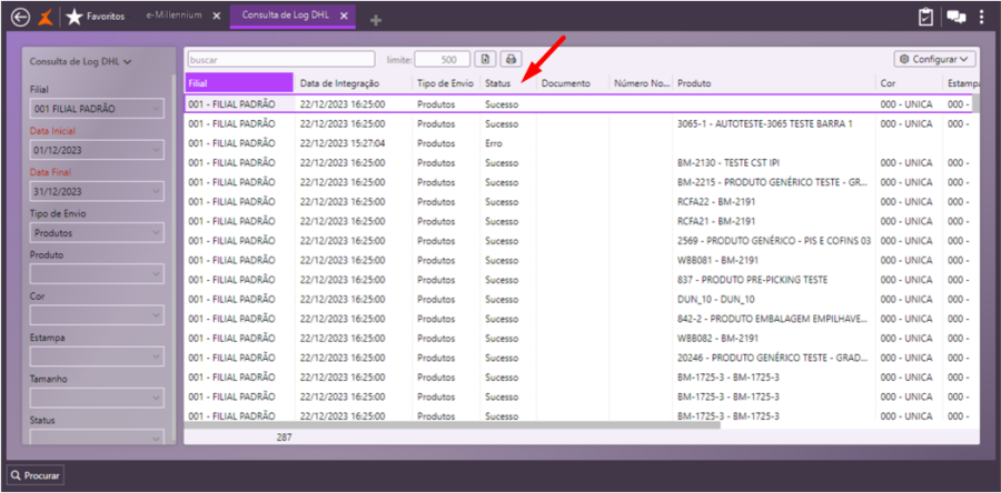 Possibilitar a visualização os Logs de todas as integrações realizadas (produto, pré-faturamento, nota fiscal, recebimentos etc.), a partir de uma tela de consultas no e-Millennium.