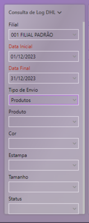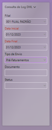 - Dependendo da opção de envio selecionada para a consulta, outros campos poderão ser exibidos. Por exemplo, ao selecionar Produto, serão habilitados os campos para especificar o SKU. No caso de selecionar o tipo de envio Pré-Faturamento, ficarão disponíveis apenas os filtros de documento e status.