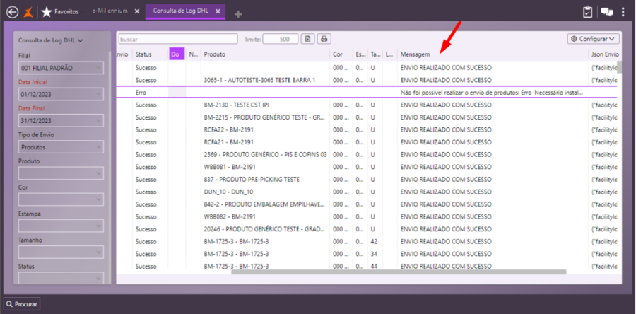 Na coluna mensagem, o sistema exibirá informações adicionais, que serão úteis para realizar correções na ocorrência de erros durante as integrações.