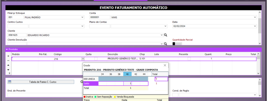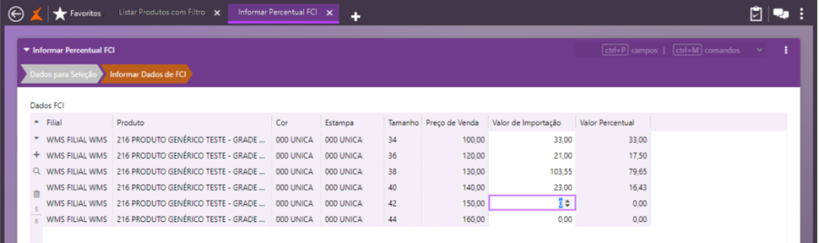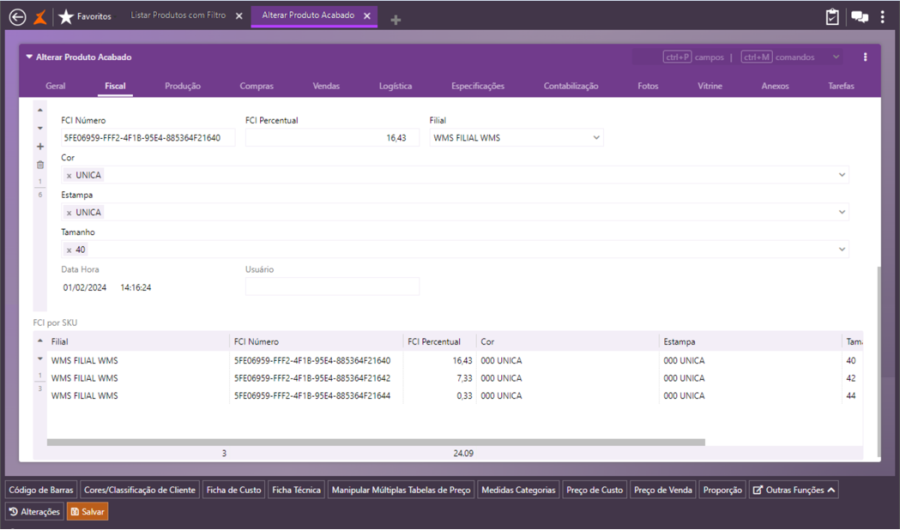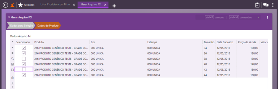 OBS.: Será possível cadastrar apenas um FCI para produto/cor/estampa/tamanho/filial.
