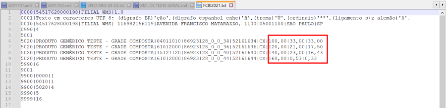 Observe no arquivo gerado, os valores informados na tela em que foram informados os percentuais.