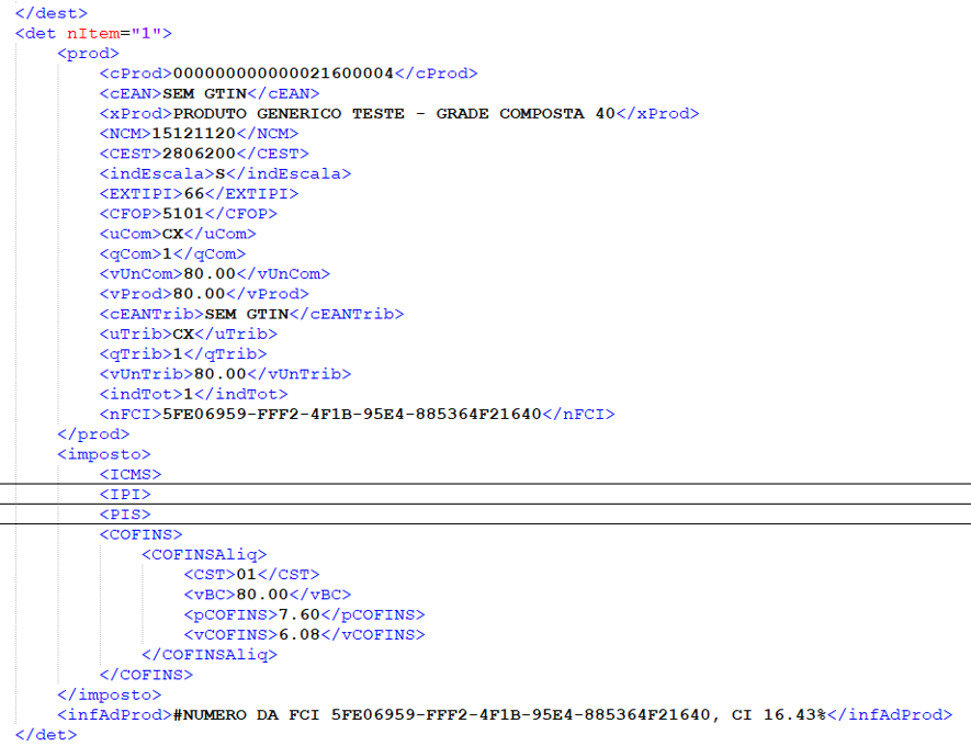 Faturamento de venda com FCI do produto no arquivo XML