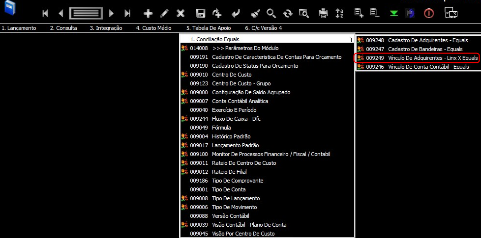 3. Selecione 5. Tabela De Apoio > 1. Conciliação Equals > 009249 Vínculo De Adquirentes - Linx X Equals