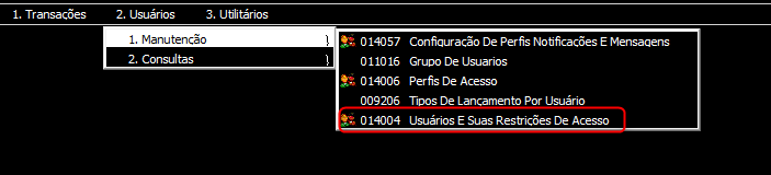 3. Selecione Usuários > Manutenção > 014004 Usuários E Suas Restrições De Acesso para abrir a tela.