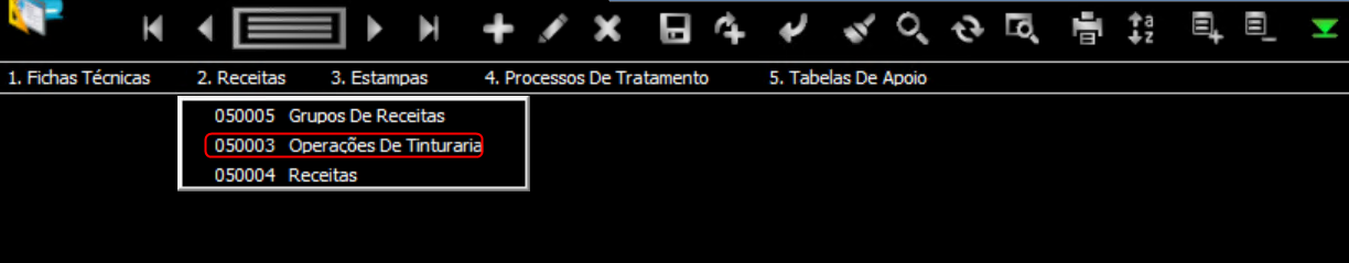 3. Selecione 2. Receitas > 050003 Operações De Tinturaria para abrir a tela.
