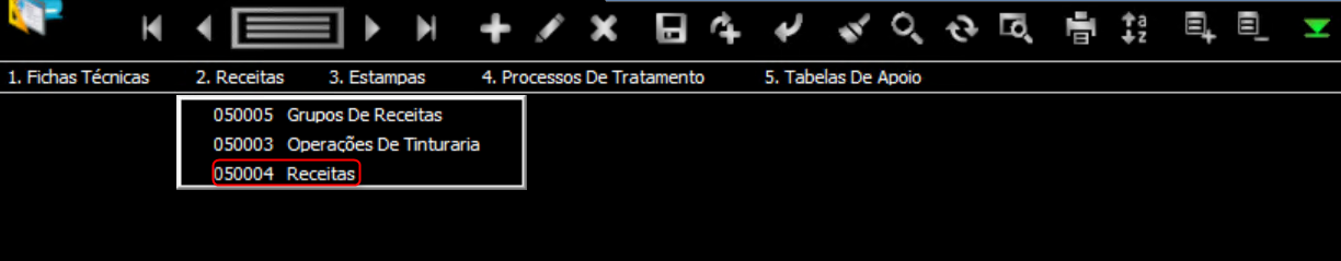 3. Selecione 2. Receitas > 050004 Receitas para abrir a tela.