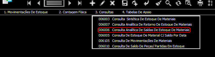 3. Selecione 3. Consultas > 006006 Consulta Analítica De Saídas De Estoque De Materiais.