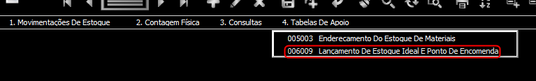 3. Selecione 4. Tabelas De Apoio > 006009 Lançamento De Estoque Ideal E Ponto De Encomenda.