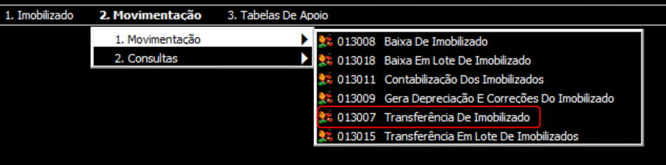 3. Selecione Movimentação > Movimentação > 013007 Transferência De Imobilizado para abrir a tela.