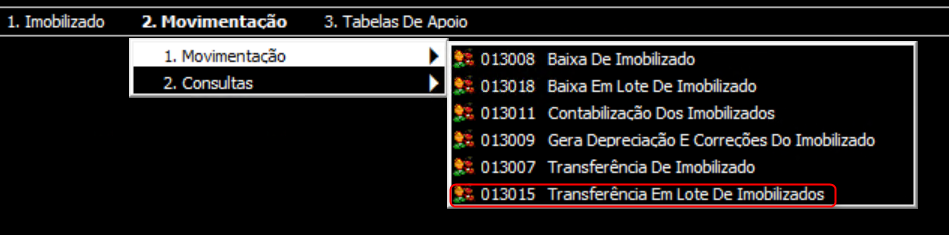 3. Selecione Movimentação > Movimentação > 013015 Transferência Em Lote De Imobilizados para abrir a tela.