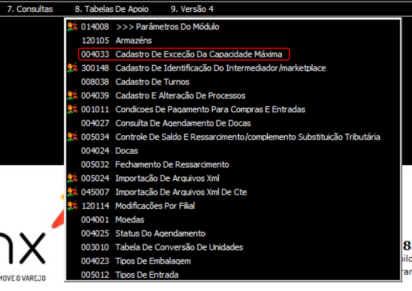 3. Selecione Tabelas De Apoio > 004033 Cadastro De Exceção Da Capacidade Máxima para abrir a tela.