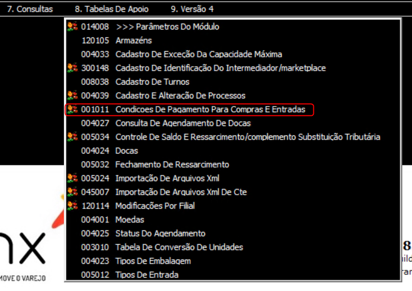 3. Selecione Tabelas De Apoio > 001011 Condições De Pagamentos Para Compras E Entradas para abrir a tela.