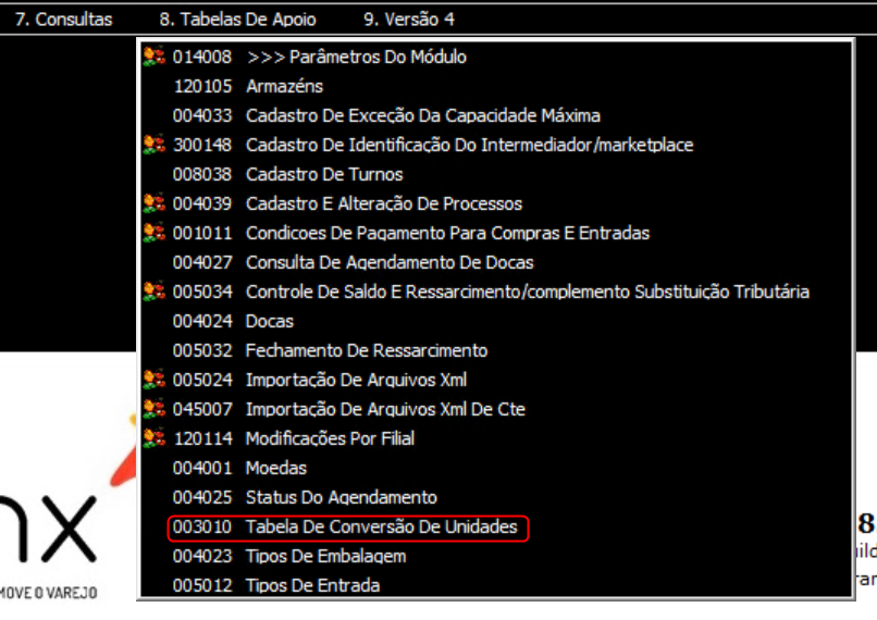3. Selecione Tabelas De Apoio > 003010 Tabela De Conversão De Unidades para abrir a tela.