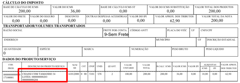 As numerações dos lotes/chassis serão preenchidas na tag InfAdProd do arquivo XML e no Danfe, as numerações serão impressas logo abaixo da descrição dos produtos.