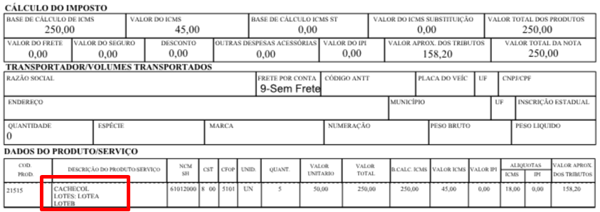 Para agrupar um produto que possui chassi (Lotes), foi desenvolvido um parâmetro que permitirá imprimir o código do produto uma única vez, e no corpo da nota, sejam apresentados todos os chassis (lotes) referentes ao produto, sendo: