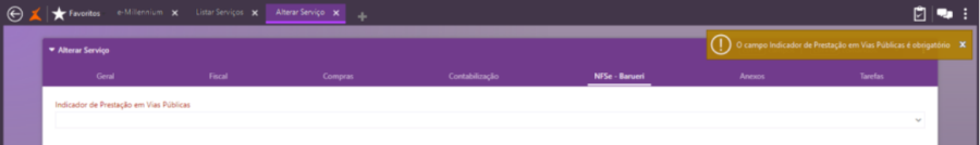 - Na guia NFSe – Barueri (Esta guia ficará visível somente quando o município de Barueri for selecionado), no campo Indicador de Prestação em Vias Públicas, selecione uma das opções para informar se o serviço é prestado em via pública ou não. O sistema