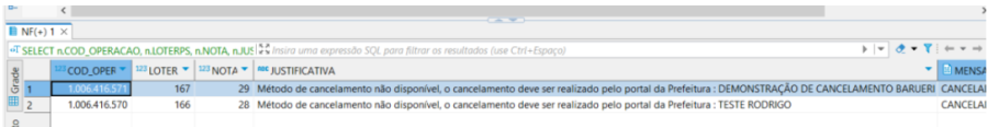 Devido a isso, caso o cancelamento tente ser realizado pelo sistema será exibida a tela para que o usuário informe a justificativa e caso prossiga o sistema apenas marcará a nota como cancelada, atualizando a data/hora de cancelamento. Será adicionado o texto "CANCELADA **Apenas no sistema, o cancelamento efetivo deverá ser realizado pelo portal da Prefeitura", no campo MENSAGENFE e o texto "Método de cancelamento não disponível, o cancelamento deve ser realizado pelo portal da Prefeitura : " que será concatenado a justificativa digitada pelo usuário.