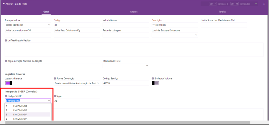 - No campo Código Sigep, selecione o serviço contratado para o tipo de frete.