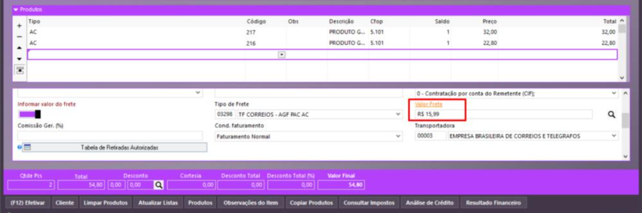 - No campo Valor Frete, clique na lupa para acionar a consulta no gateway e visualizar as opções de fretes disponíveis para o tipo de frete informado.