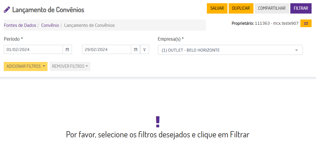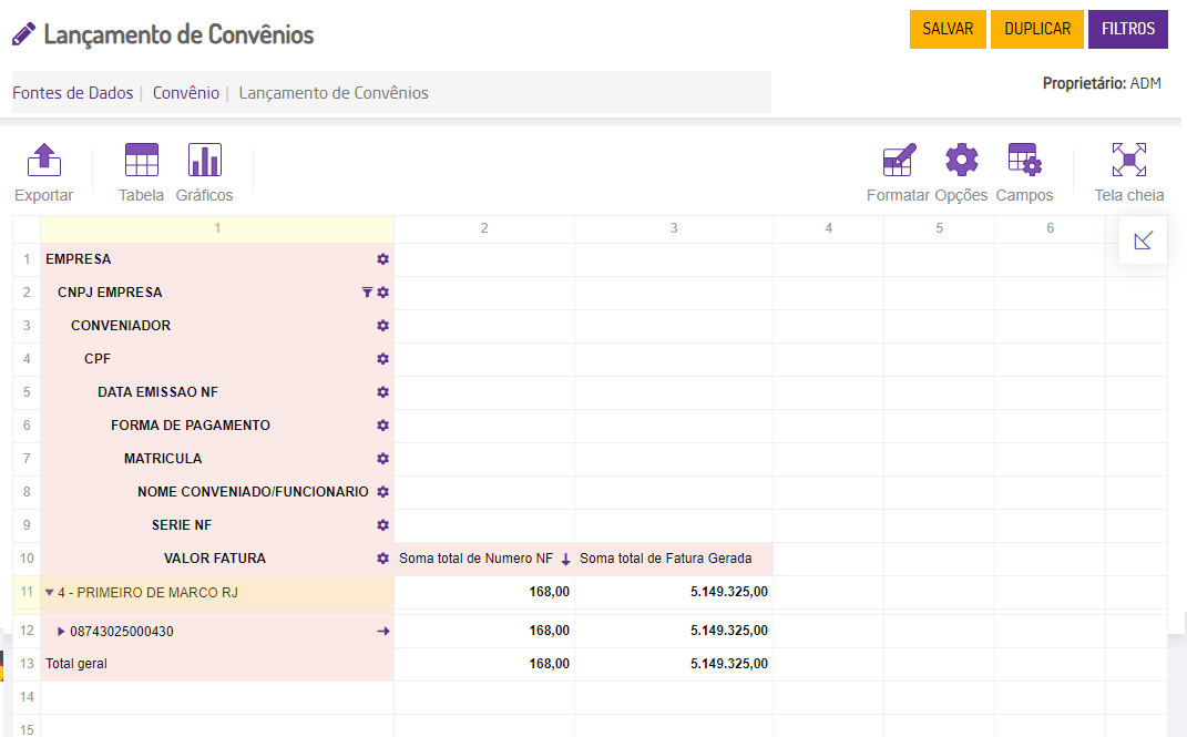Para visualizar o relatório é necessário acessar Gerador de Relatório > Acessar > Fonte de Dados: Convênio > Visão: Lançamento de Convênios > Acessar.