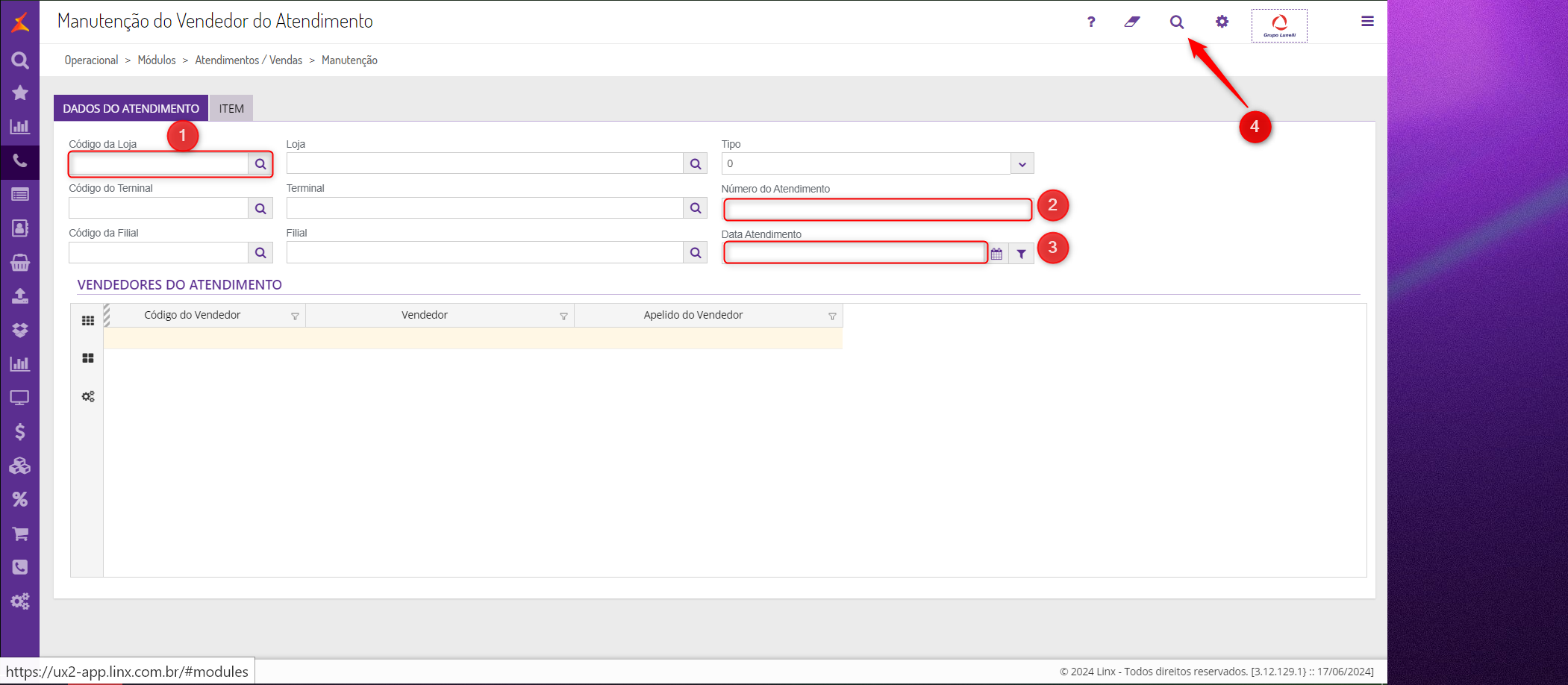 - Acesse no Linx UX a tela Manutenção de Vendedor do Atendimento, conforme imagem abaixo: