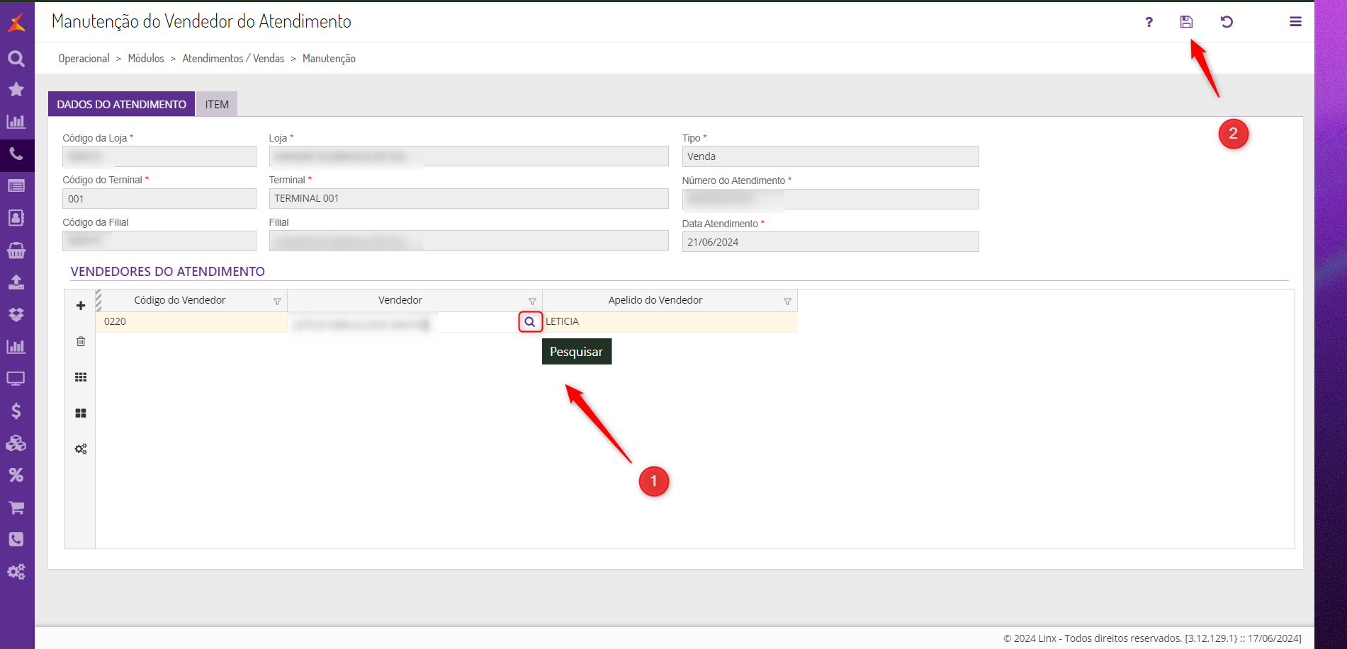 - Na aba Vendedores do Atendimento pesquise a vendedora que deveria ser utilizada no atendimento e salve, conforme imagem abaixo: