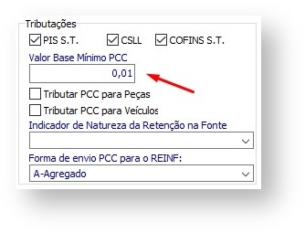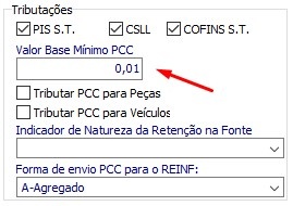 1.3 - No campo “Valor Base Mínimo PCC”, caso queira, poderá informar qual o valor mínimo para cálculo da base do PCC.