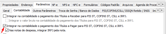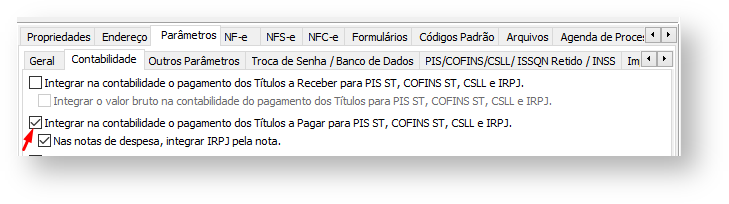 2.2 - Marque a flag “Integrar na contabilidade o pagamento dos Títulos a Pagar para PIS ST, COFINS ST, CSLL e IRPJ.”.
