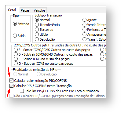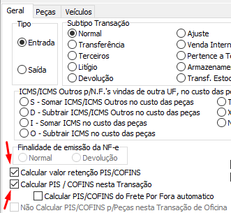 3.1 - Escolha a transação de entrada desejada e, na aba “Geral” marque as seguintes flags, “Calcular valor retenção PIS/COFINS” e “Calcular PIS/COFINS nesta Transação”