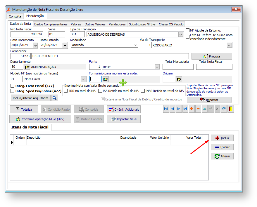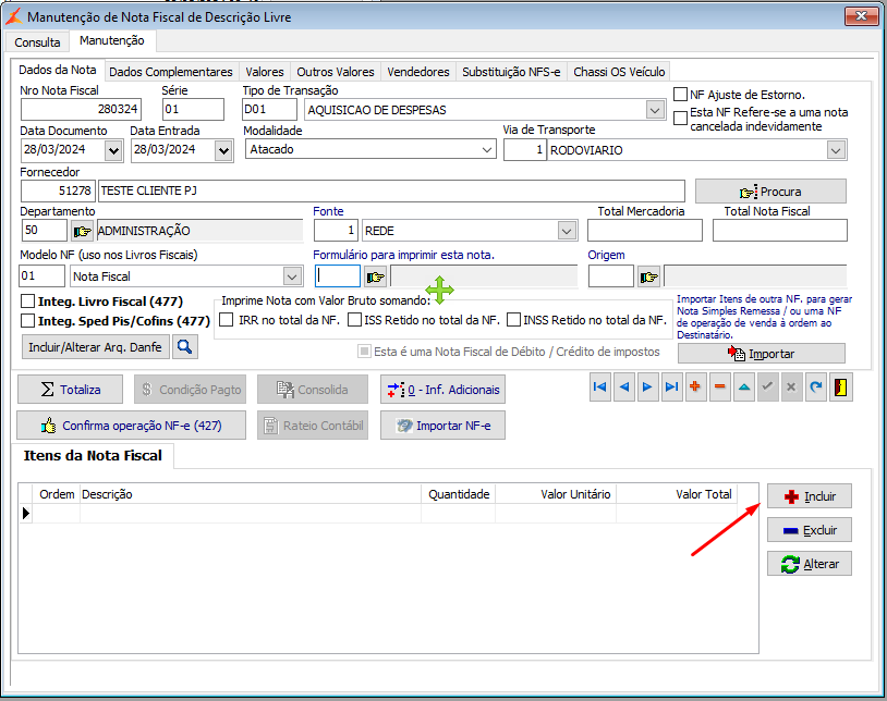 4 - Feita toda a parametrização, podemos dar início a entrada da nota.