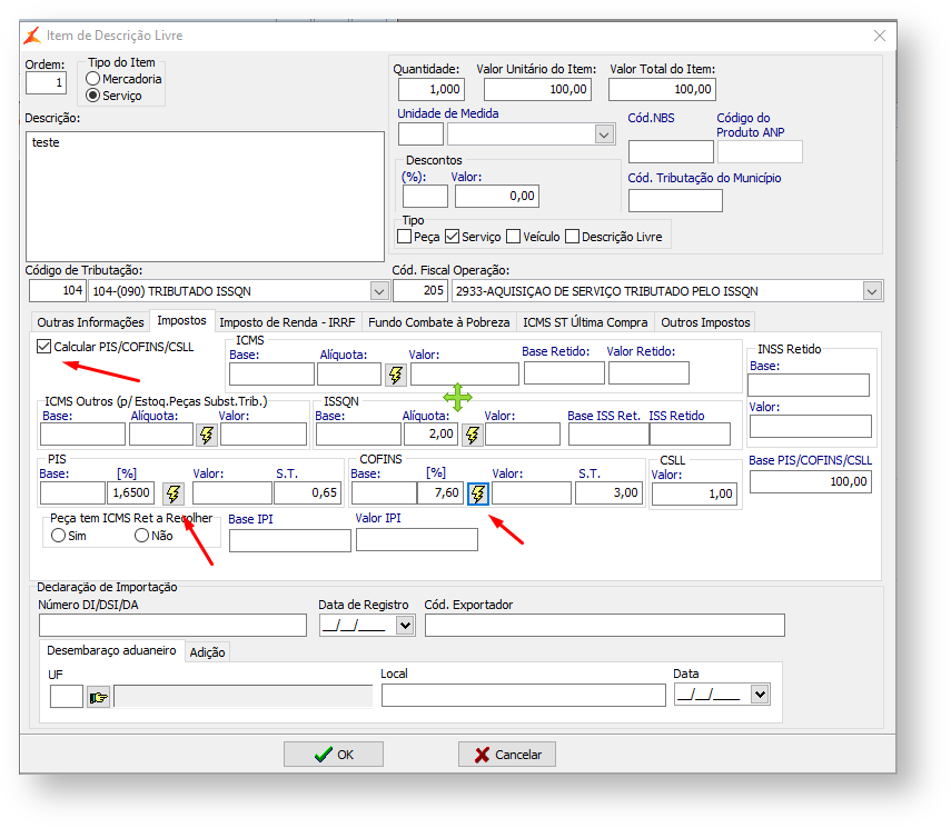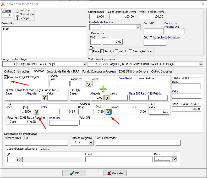 4.3 - Coloque as informações obrigatórias, e na aba “Impostos” marque a flag “Calcular PIS/COFINS/CSLL”, e clique no raio para o sistema calcular os valores.