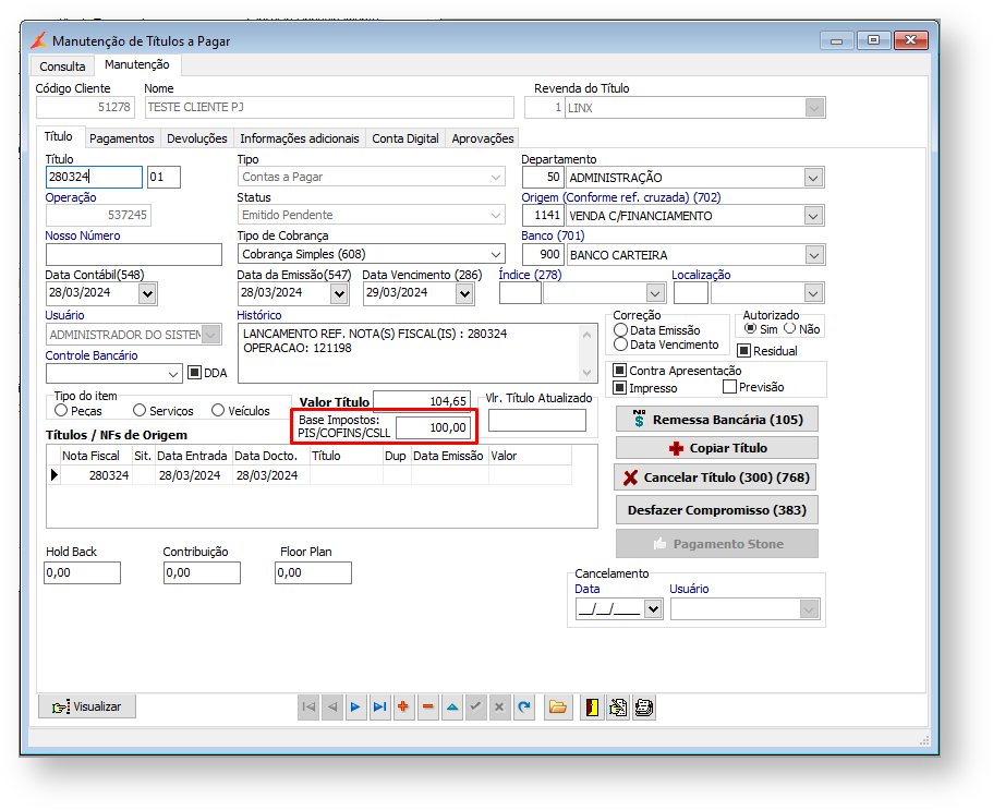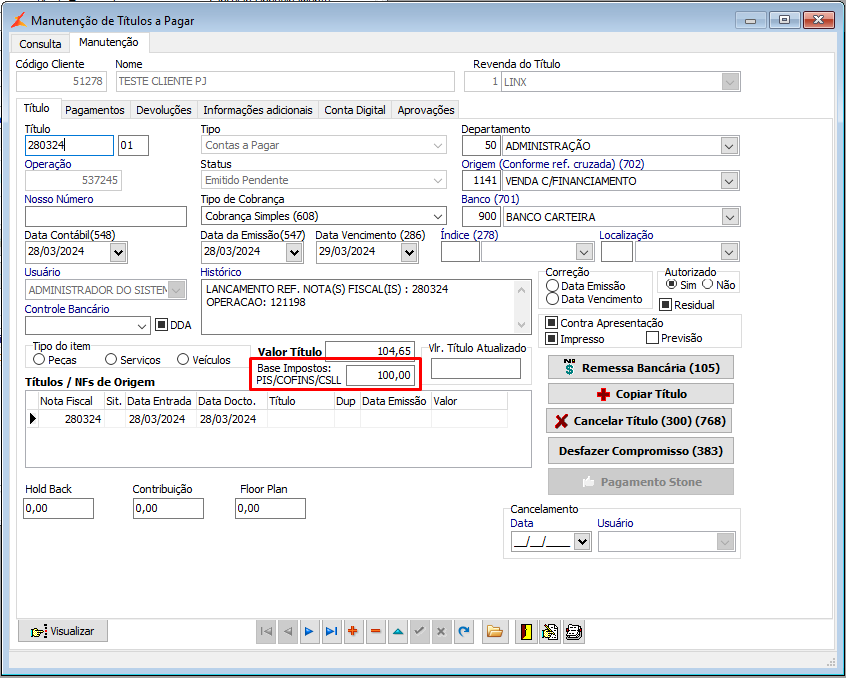 5.1 - Na aba “Título” podemos ver a base dos impostos destacados na nota.